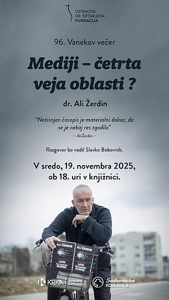 Dr. Ali Žerdin (1965), sociolog, novinar, publicist, se je z novinarstvom ukvarjal že kot študent sociologije na Fakulteti za družbene vede. Sodeloval je s časopisom Tribuna, bil, kot so ocenili poznavalci, legendarni novinar in odgovorni urednik na Radiu Študent v njegovih najbolj viharnih časih (sredi 80. let), kot novinar, in namestnik odgovornega urednika je pustil nepozabne sledi v tedniku Mladina, da bi nadaljeval svojo novinarsko pot kot urednik priloge Objektiv in odgovorni urednik časnika Dnevnik. Od leta 2010 je urednik Sobotne priloge Dela, posebne priloge, ki je mnogo več kot le fizična priloga kateri daje Ali Žerdini kot urednik in avtor nepogrešljivih vsakokratnih uvodnikov prepoznaven in privlačen »imidž«. Leta 2008 je prejel nagrado Društva novinarjev Slovenije. Celotna predstavitev na drugi/hrbtni strani vabila.