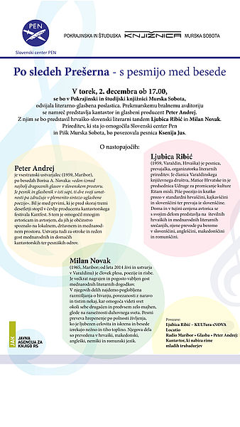 V torek, 2. decembra ob 17.00, se bo v Pokrajinski in študijski knjižnici Murska Sobota, odvijala literarno-glasbena poslastica. Prekmurskemu bralnemu avditoriju se namreč predstavlja kantavtor in glasbeni producent Peter Andrej. Z njim se bo predstavil hrvaško-slovenski literarni tandem Ljubica Ribić in Milan Novak. Prireditev, ki sta jo omogočila Slovenski center Pen in Pišk Murska Sobota, bo povezovala pesnica Ksenija Jus.